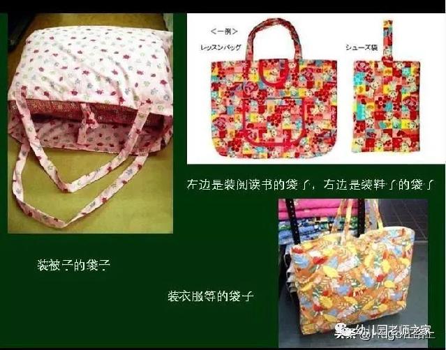在办理入园手续的第一天,日本的幼儿园就要妈妈准备若干个大大小小的包。书包、装毛毯的包、装餐具的包、餐具盒、装衣服的包、装备换衣服的包、装换下来衣服的包、装鞋子的包等等,而且对于包的大小也有规定,有的幼儿园甚至要求所有的包都要妈妈一针一线地缝制出来。